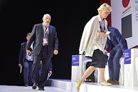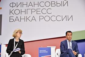 Финансовый конгресс Банка России на площадке Новой сцены Александринского театра. День третий. Советник председателя Центрального Банка России Ксения Юдаева (слева) и старший вице-президент - руководитель блока "Риски" ПАО "Сбербанк России" Джангир Джангиров (справа) во время конгресса.