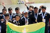 Международный культурно-спортивный фестиваль "Алтайская регата. Фестиваль Драконов". Соревнования по гребле на драгонботе на Гребном канале на реке Обь. Команда Мьянмы на церемонии награждения.