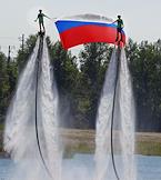 Международный культурно-спортивный фестиваль "Алтайская регата. Фестиваль Драконов". Церемония открытия фестиваля. Жанровая фотография. Спортсмены на гидрофлайтах с флагом России.