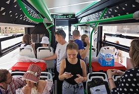 Начало тестирования нового электробуса "Генерал" в Екатеринбурге. В период проведения промышленной выставки "Иннопром" новая машина будет выполнять роль шаттла и доставлять горожан от станции метро "Ботаническая" до выставочного центра "Екатеринбург-ЭКСПО". Жанровая фотография. Пассажиры в салоне электробуса.