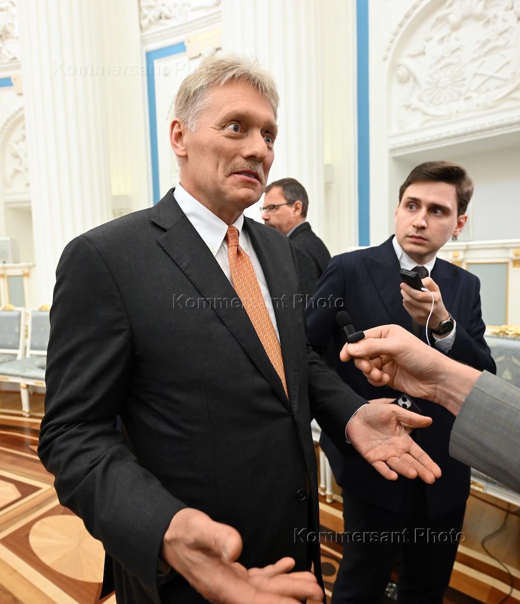 Встреча президента России Владимира Путина и премьер-министра Венгрии Виктора Орбана в Кремле. Заместитель руководителя администрации президента России, пресс-секретарь президента Дмитрий Песков (слева) после пресс-конференции по итогам встречи.