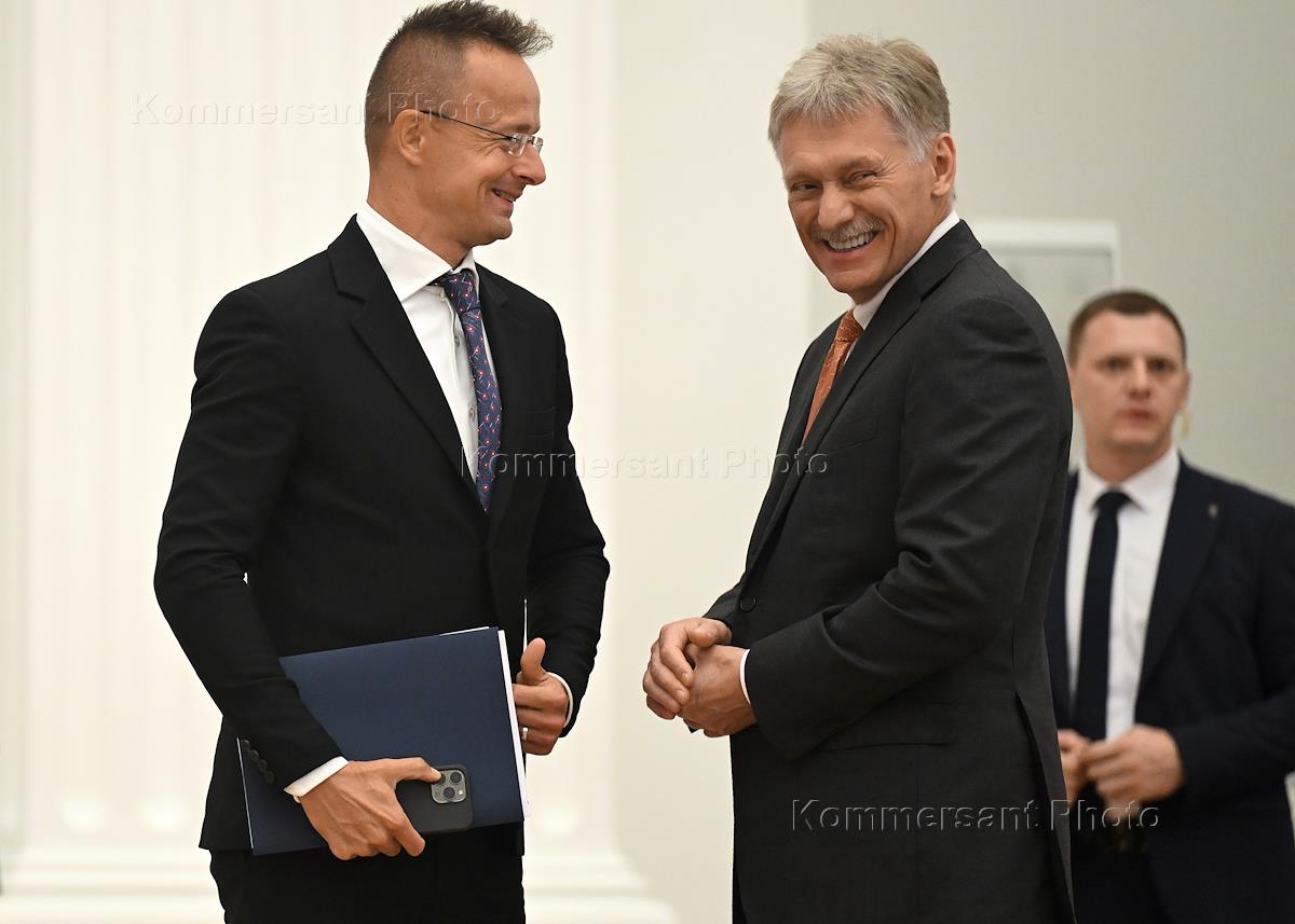 Встреча президента России Владимира Путина и премьер-министра Венгрии Виктора Орбана в Кремле. Министр иностранных дел и внешнеэкономических связей Венгрии Петер Сийярто и заместитель руководителя администрации президента России, пресс-секретарь президента Дмитрий Песков (в центре) во время пресс-конференции по итогам встречи.