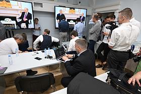 Встреча президента России Владимира Путина и премьер-министра Венгрии Виктора Орбана в Кремле. Жанровая фотография. Журналисты в пресс-центре во время встречи.