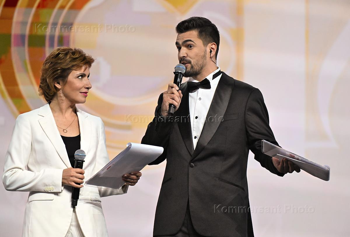 Мероприятия, посвященные завершению работы Международной выставки-форума "Россия" на ВДНХ. Церемония награждения за работу на выставке в павильоне №75. Заместитель директора МТРК "Мир", директор телеканалов "МИР" и "МИР 24", телеведущая Екатерина Абрамова (слева) и певец, телеведущий Вячеслав Макаров (справа) во время церемонии.