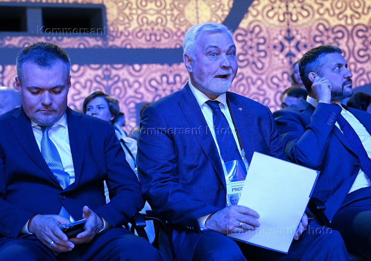 Мероприятия, посвященные завершению работы Международной выставки-форума "Россия" на ВДНХ. Церемония награждения за работу на выставке в павильоне №75. Слева направо: полномочный представитель президента России в Центральном федеральном округе (ЦФО) Игорь Щеголев, первый заместитель главы администрации президента России Сергей Кириенко и глава Донецкой Народной Республики (ДНР) Денис Пушилин перед началом церемонии.