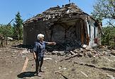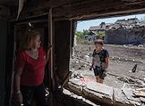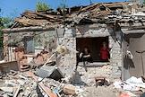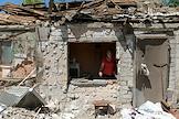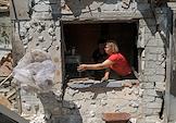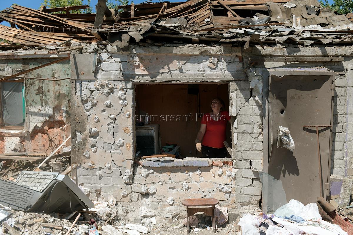 Последствия обстрела города Ясиноватая. Жанровая фотография. Женщина в разрушенном в результате обстрела дом.