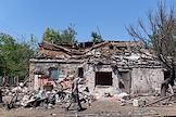 Последствия обстрела города Ясиноватая. Жанровая фотография. Разрушенный в результате обстрела дом.