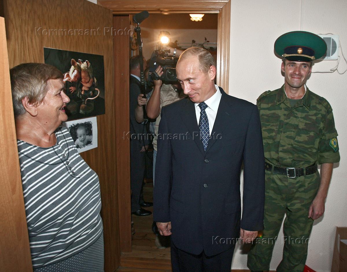 Russian President Vladimir Putin, center, visited Yermolovka frontier outpost Commander Sergey Korobov, right, in Southern Federal District.