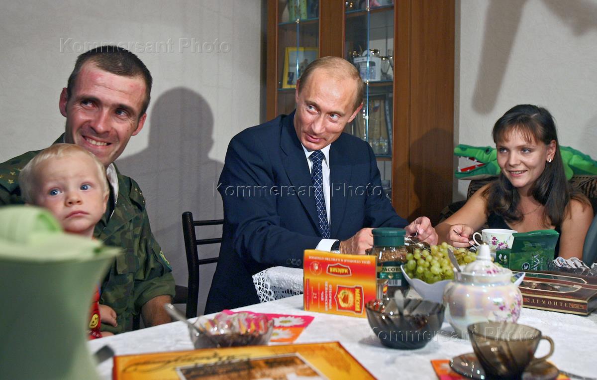Russian President Vladimir Putin, center, visited Yermolovka frontier outpost Commander Sergey Korobov, left, in Southern Federal District.