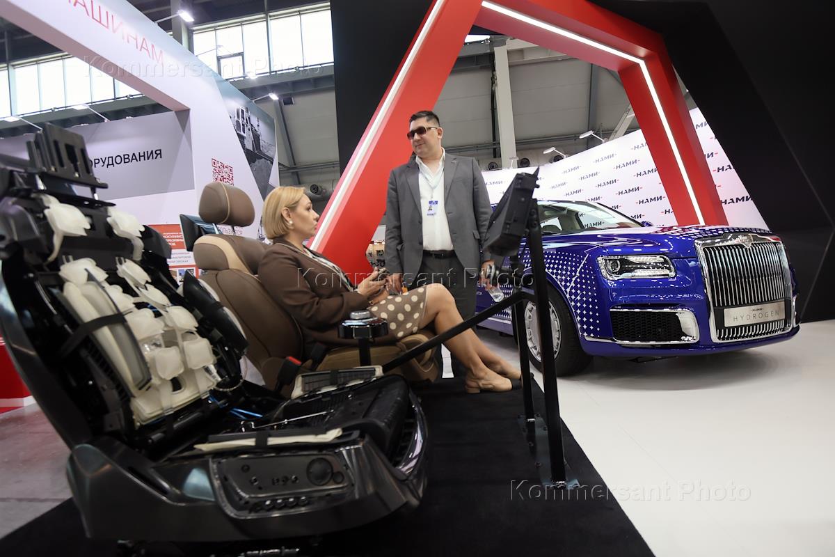 Международная промышленная выставка "Иннопром-2024" в Международном выставочном центре "Екатеринбург-Экспо". Жанровая фотография. Первый водородный автомобиль класса "люкс" NAMI Hydrogen, построенный на базе Aurus, представленный Научно-исследовательским автомобильным и автомоторным институтом (НАМИ).