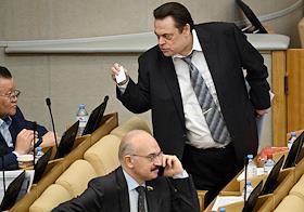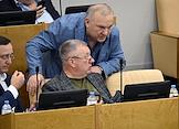 Пленарное заседание Государственной думы (ГД) России. Заместитель председателя комитета ГД России по экологии, природным ресурсам и охране окружающей среды Олег Лебедев (справа) и член комитета Государственной думы по охране здоровья Николай Осадчий (слева) во время заседания.