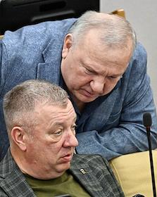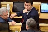 Пленарное заседание Государственной думы (ГД) России. Председатель комитета ГД России по делам национальностей Геннадий Семигин (справа) и председатель комитета ГД России по науке и высшему образованию Сергей Кабышев (в центре) во время заседания.