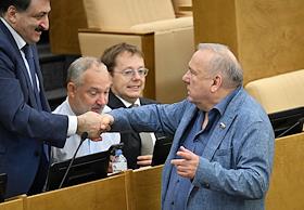 Пленарное заседание Государственной думы (ГД) России. Заместитель председателя комитета ГД России по развитию гражданского общества, вопросам общественных и религиозных объединений Владимир Шаманов (справа) и первый заместитель председателя комитета ГД России по труду, социальной политике и делам ветеранов Михаил Тарасенко (в центре) во время заседания.