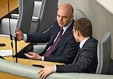 Пленарное заседание Государственной думы (ГД) России. Министр финансов России Антон Силуанов (слева) и статс-секретарь – заместитель министра финансов России Алексей Сазанов (справа) во время заседания.