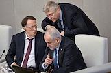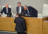 Пленарное заседание Государственной думы (ГД) России. Справа налево: член комитета ГД России по бюджету и налогам Айрат Фаррахов, член комитета ГД России по охране здоровья Андрей Горохов и первый заместитель председателя комитета ГД России по аграрным вопросам Владимир Плотников во время заседания.