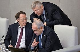 Пленарное заседание Государственной думы (ГД) России. Глава комитета ГД России по безопасности и противодействию коррупции Василий Пискарев (в центре) и заместитель председателя ГД России Петр Толстой (справа) во время заседания.