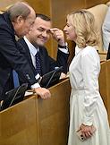 Пленарное заседание Государственной думы (ГД) России. Заместитель председателя комитета ГД по труду, социальной политике и делам ветеранов Михаил Терентьев (в центре), член комитета ГД России по транспорту и строительству Виктор Дерябкин (второй слева) и первый заместитель председателя комитета ГД России по государственному строительству и законодательству Ирина Панькина (справа) во время заседания.