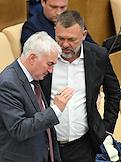 Пленарное заседание Государственной думы (ГД) России. Член комитета ГД России по энергетике Джамаладин Гасанов (слева) и заместитель председателя комитета ГД России по развитию гражданского общества, вопросам общественных и религиозных объединений Владимир Шаманов (справа) во время заседания.