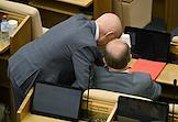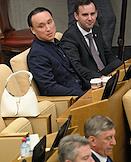 Пленарное заседание Государственной думы (ГД) России. Председатель комитета ГД Росси по туризму и развитию туристической инфраструктуры Сангаджи Тарбаев (слева) и председатель комитета ГД России по малому и среднему предпринимательству Александр Демин (справа) во время заседания.