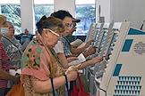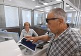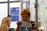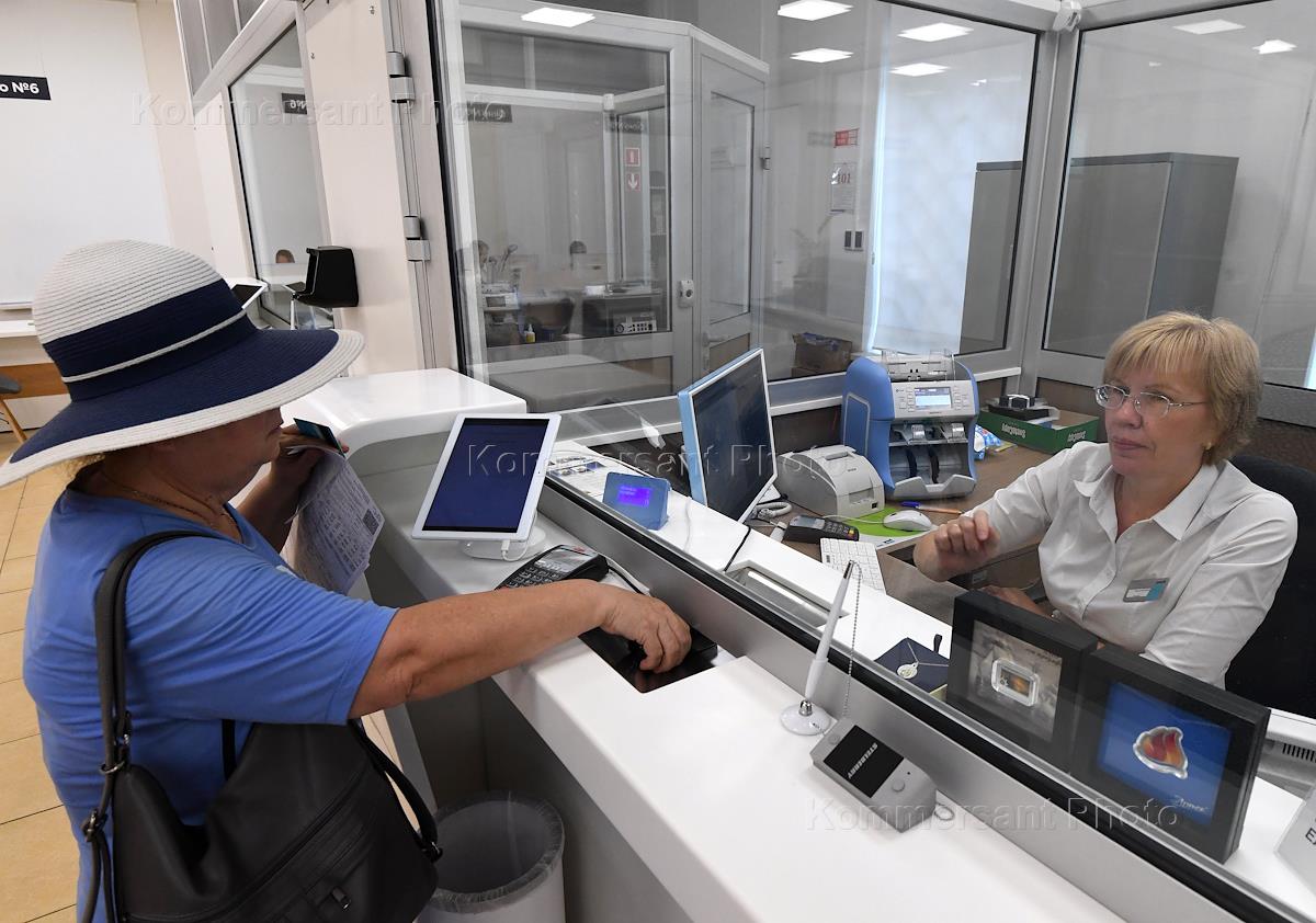 Работа отделения Российского национального коммерческого банка (РНКБ). Банк ВТБ приступает к интеграции РНКБ, которая завершится в 2025 году переходом банка под бренд ВТБ. Жанровая фотография. Пожилая женщина с платежкой коммунальных услуг в отделение банка.