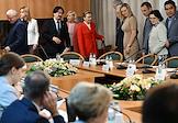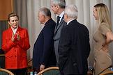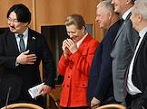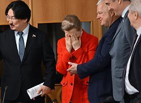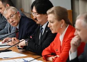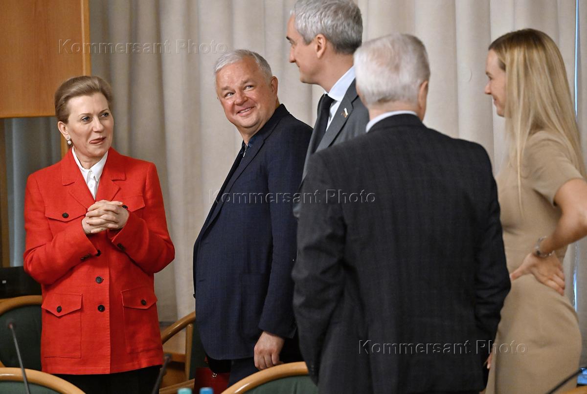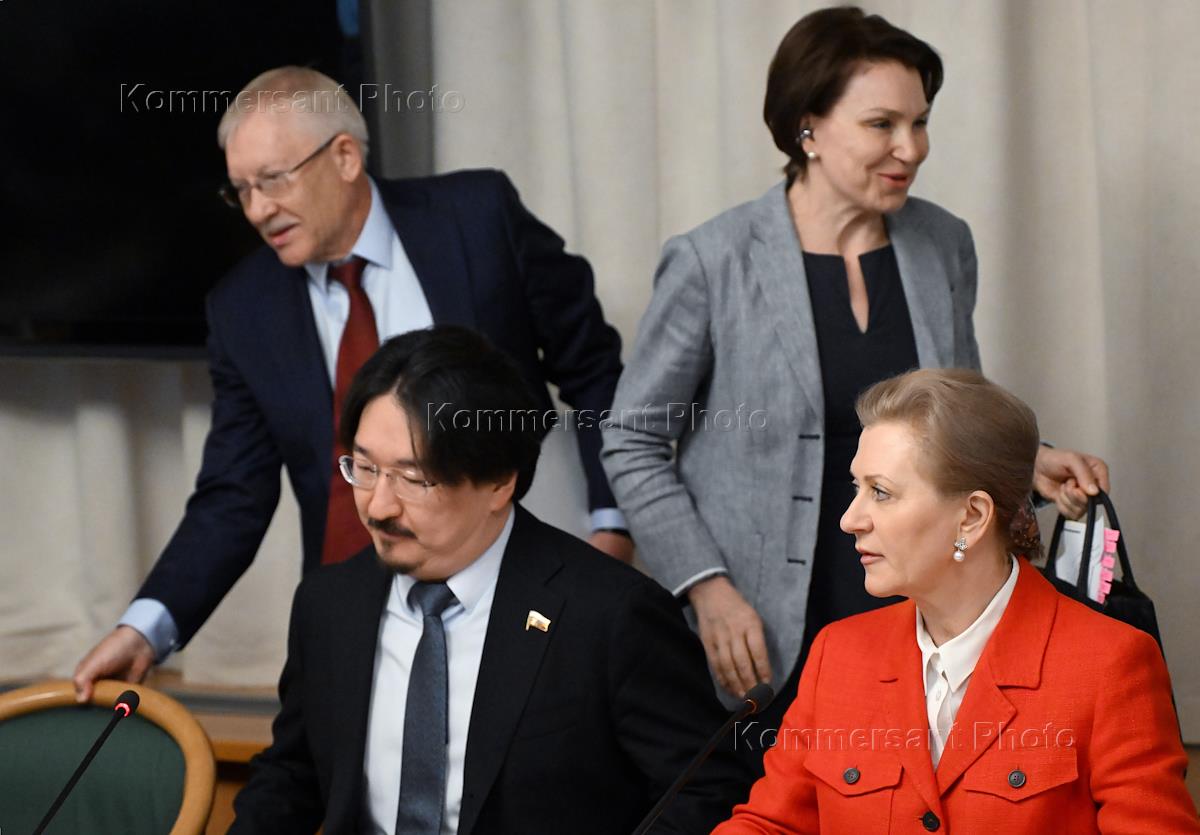 Заседание комитета Государственной думы (ГД) России по охране здоровья в ГД России. Председатель комитета ГД России по охране здоровья Бадма Башанкаев (третий слева) и руководитель Федеральной службы по надзору в сфере защиты прав потребителей и благополучия человека (Роспотребнадзор) - главный государственный санитарный врач России Анна Попова (в центре) перед началом заседания.