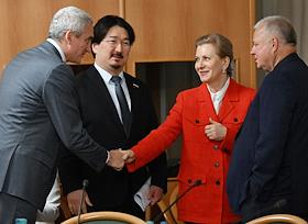 Заседание комитета Государственной думы (ГД) России по охране здоровья в ГД России. Слева направо: председатель комитета ГД России по охране здоровья Бадма Башанкаев, руководитель Федеральной службы по надзору в сфере защиты прав потребителей и благополучия человека (Роспотребнадзор) - главный государственный санитарный врач России Анна Попова, член комитета ГД России по государственному строительству и законодательству Олег Иванинский и заместитель председателя комитета ГД России по охране здоровья Евгений Нифантьев перед началом заседания.