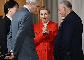 Заседание комитета Государственной думы (ГД) России по охране здоровья в ГД России. Слева направо: руководитель Федеральной службы по надзору в сфере защиты прав потребителей и благополучия человека (Роспотребнадзор) - главный государственный санитарный врач России Анна Попова, председатель комитета ГД России по контролю Олег Морозов и статс-секретарь – заместитель руководителя Роспотребнадзора Михаил Орлов перед началом заседания.