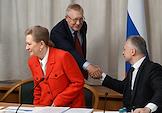 Заседание комитета Государственной думы (ГД) России по охране здоровья в ГД России. Слева направо: руководитель Федеральной службы по надзору в сфере защиты прав потребителей и благополучия человека (Роспотребнадзор) - главный государственный санитарный врач России Анна Попова, член комитета ГД России по государственному строительству и законодательству Олег Иванинский и заместитель председателя комитета ГД России по охране здоровья Евгений Нифантьев перед началом заседания.