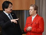 Заседание комитета Государственной думы (ГД) России по охране здоровья в ГД России. Председатель комитета ГД России по охране здоровья Бадма Башанкаев (слева) и руководитель Федеральной службы по надзору в сфере защиты прав потребителей и благополучия человека (Роспотребнадзор) - главный государственный санитарный врач России Анна Попова (справа) перед началом заседания.