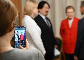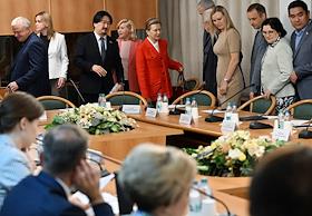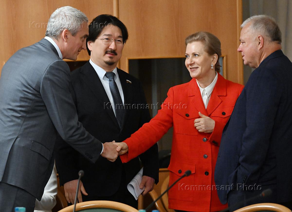 Заседание комитета Государственной думы (ГД) России по охране здоровья в ГД России. Председатель комитета ГД России по охране здоровья Бадма Башанкаев (третий слева) и руководитель Федеральной службы по надзору в сфере защиты прав потребителей и благополучия человека (Роспотребнадзор) - главный государственный санитарный врач России Анна Попова (в центре) перед началом заседания.