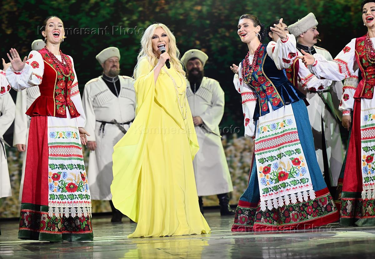 XXXIII Международный фестиваль искусств "Славянский базар" в Витебске. Церемония открытия на сцене Летнего амфитеатра. Певица Таисия Повалий во время выступления с Кубанским казачьим хором.