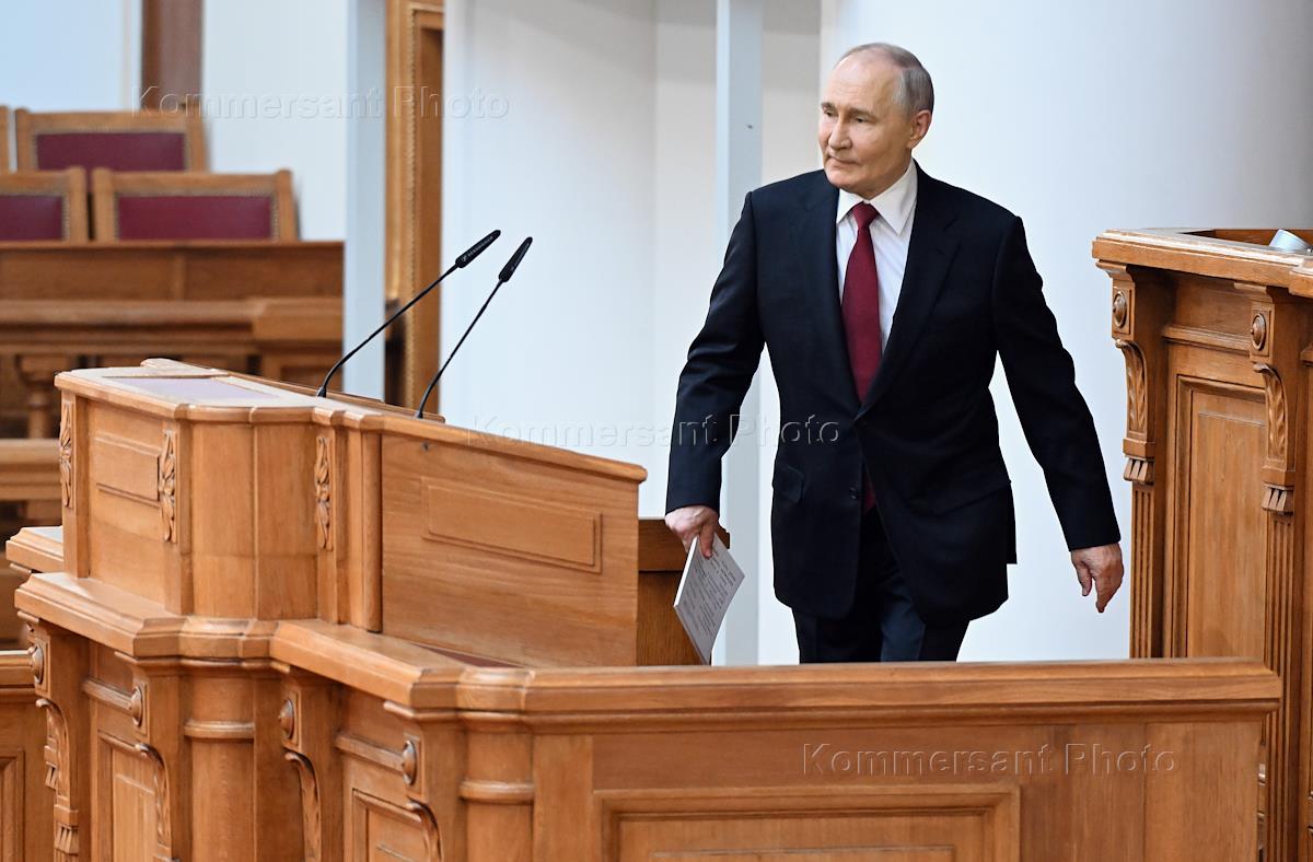 Рабочая поездка президента России Владимира Путина в Санкт-Петербург. Х Парламентский форум БРИКС в Таврическом дворце. Президент России Владимир Путин во время выступлении на сессии № 1 пленарного заседания Форума в расширенном формате с участием представителей парламентских делегаций стран БРИКС, приглашенных стран и межпарламентских организаций.