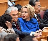 Рабочая поездка президента России Владимира Путина в Санкт-Петербург. Х Парламентский форум БРИКС в Таврическом дворце. Сессия № 1 пленарного заседания Форума в расширенном формате с участием представителей парламентских делегаций стран БРИКС, приглашенных стран и межпарламентских организаций. Председатель Совета Федерации России Валентина Матвиенко во время заседания.