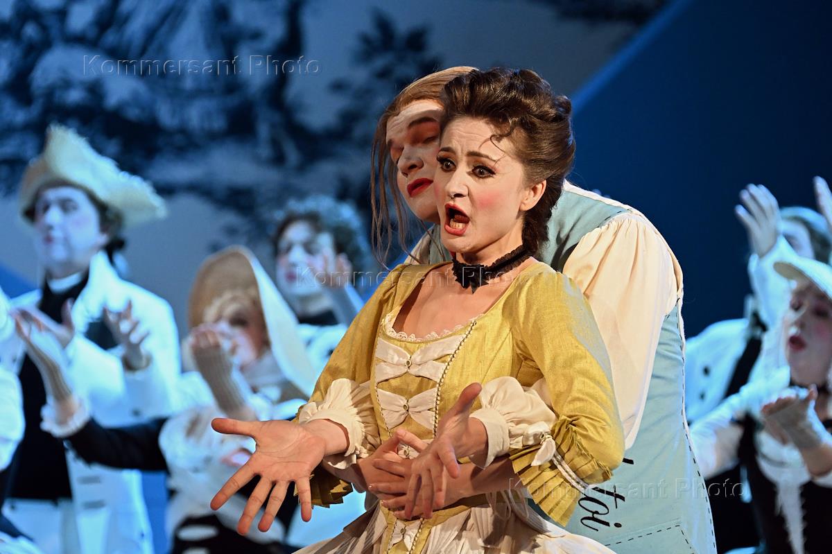 Премьера комической оперы "Почтальон из Лонжюмо" композитора Адольфа Адана в постановке Евгения Писарева на сцене Московского театра "Новая Опера". Оперная певица Мария Буйносова (справа) во время спектакля.