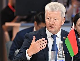 XXXIII Международный фестиваль искусств "Славянский базар" в Витебске. День национальных культур стран – участниц Шанхайской организации сотрудничества (ШОС). Встреча министров культуры стран-участниц ШОС "Диалог культур - фактор единения народов стран ШОС" в Международном пресс-центре концертного зала (КЗ) "Витебск". Заместитель председателя Витебского областного исполнительного комитета Вячеслав Дурнов во время встречи.