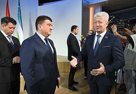 XXXIII Международный фестиваль искусств "Славянский базар" в Витебске. День национальных культур стран – участниц Шанхайской организации сотрудничества (ШОС). Встреча министров культуры стран-участниц ШОС "Диалог культур - фактор единения народов стран ШОС" в Международном пресс-центре концертного зала (КЗ) "Витебск". Справа налево: министр культуры Беларуси Анатолий Маркевич, первый заместитель министра культуры Узбекистана Авазхан Таджиханов и заместитель министра культуры, информации, спорта и молодежной политики Киргизии Тимурлан Ажымалиев после встречи.
