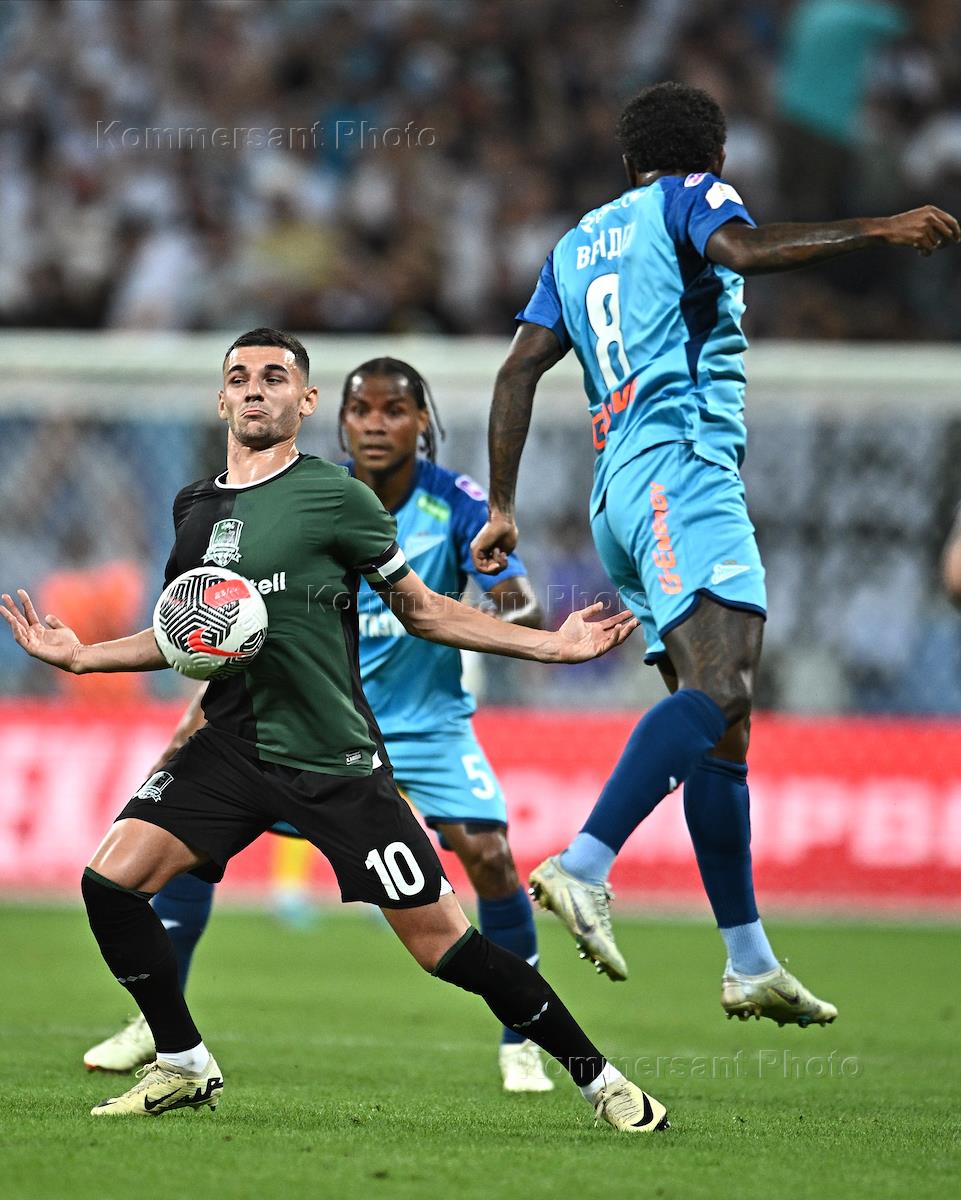 OLIMPBET Russian Football Super Cup. Match between the teams "Zenit" (St. Petersburg) - "Krasnodar" (Krasnodar) at the Volgograd Arena stadium. Krasnodar team player Kayo Pantalean (right) and Zenit team player Mateo Cassierra (left) during the match.