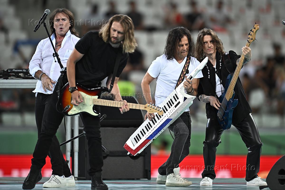OLIMPBET Суперкубок России по футболу. Матч между командами "Зенит" (Санкт-Петербург) - "Краснодар" (Краснодар) на стадионе "Волгоград Арена". Группа "Земляне" во время исполнения государственного гимна России перед началом матча.