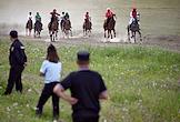 XVIII Межрегиональный праздник алтайского народа "Эл-Ойын 2024" в урочище Ойбок Усть-Канского района. Жанровая фотография. Участники состязаний во время скачки на дистанцию 12 км.