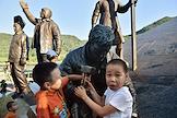 Саяно-Шушенская ГЭС. Памятник "Покорителям Енисея" в поселке Черемушки. Жанровая фотография. Дети у памятника.