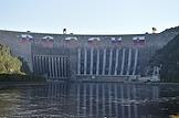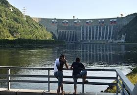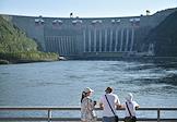 Саяно-Шушенская ГЭС на реке Енисее. Туристы на смотровой площадке в поселке Черемушки. Жанровая фотография.