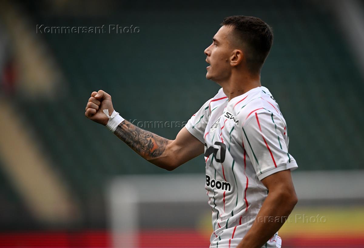 Российская Премьер-Лига (РПЛ). МИР- Чемпионат России по футболу 2024/2025. 1-й тур. Матч между командами "Локомотив" (Москва) - "Акрон" (Тольятти) на стадионе "РЖД Арена (Локомотив)". Игрок команды "Акрон" Кирилл Данилов во время матча.