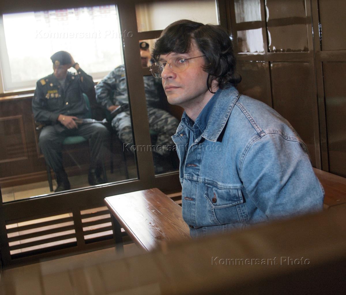 Andrey Pylev, left, accused in organization of murder of famous killer Aleksandr Solonik, is shown in Moscow City court during the announcement of his verdict.
