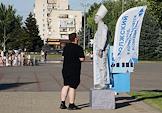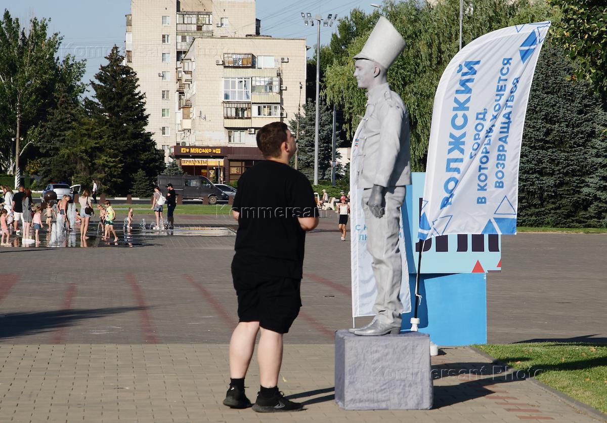 Виды города Волжский. Жанровая фотография. Живая скульптура, мим в военной форме русской армии начала ХIХ века на площади.