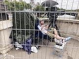 Виды Парижа. Жанровая фотография. Оператор с видеокамерой в палатке на берегу реки Сены.