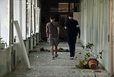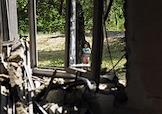 Последствия обстрела Калининского района Донецка, в результате которого пострадала школа. Сотрудник совместного центра контроля и координации вопросов, связанных с военными преступлениями Украины (СЦКК) у школы №96, поврежденной в результате обстрела со стороны ВСУ.