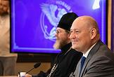 Пресс-конференция, посвященная к открытию музейно-храмового комплекса "Новый Херсонес". Митрополит Крымский и Симферопольский Тихон (Шевкунов) (слева) и губернатор Севастополя Михаил Развожаев (справа) во время пресс-конференции.