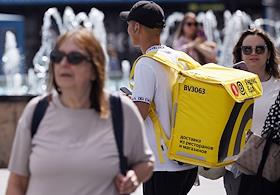 Жанровая фотография. Курьер сервиса доставки еды "Яндекс" с рюкзаком идет по улице города.