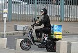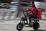 Жанровая фотография. Виды Москвы. Курьер сервиса доставки "Купер" (Сбермаркет) на мопеде едет по улице.