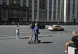 Жанровая фотография. Улица Охотный ряд. Здание Государственной думы России. Мужчина в деловом костюме едет по улице на электросамокате.